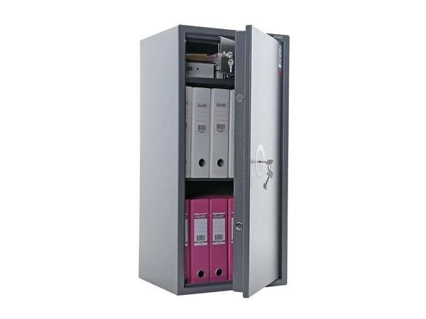 AIKO TSN-90 T — офисный сейф эконом-класса для хранения документов и небольших сумм денег. Обеспечивает базовый уровень защиты при небольшой стоимости. Качество подтверждено сертификатом соответствия ГОСТ Р 55148-2012. Корпус выполнен из прочной стали. Дверь имеет усиленную конструкцию: толщина лицевой панели — 59 мм. Запирается ключевым замком "Border" Внутри — запираемое кассовое отделение и съемная полка. В трейзере можно хранить наличность, трудовые книжки, печати организации и т.д. Высота установки полки регулируется произвольно. Размеры сейфа позволяют разместить до 6 толстых (75 мм) папок-регистраторов под документы формата А4 типа Корона, Bantex и т.п. Износостойкое порошковое покрытие. Предусмотрена возможность анкерного крепления сейфа к полу или стене.