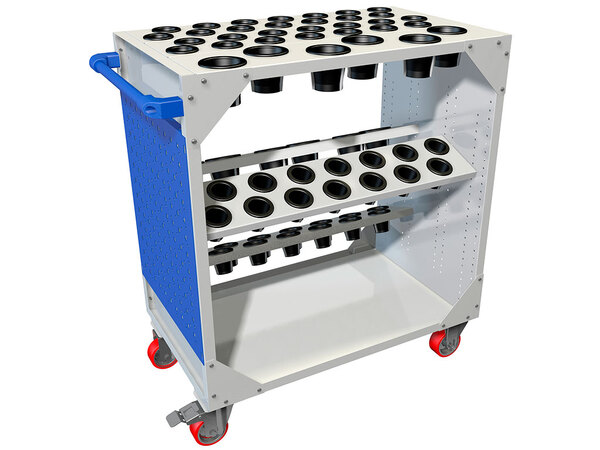 предназначены для хранения и оперативного перемещения оснастки на производственных предприятиях комплектуются удобной ручкой максимальная нагрузка на тележку- 400 кг возможность комплектации полками с отверстиями для инструмента размерами SK 40 и SK 50 полки устанавливаются горизонтально и под наклоном 20° на полку можно установить 14шт SK 40 , 6шт SK 50 пластиковые держатели идут в комплект полки большегрузные поворотные колеса с износостойкой шиной из полиуретана, обод выполнен из чугуна и оснащен смазочным ниппелем, в конструкции применен сварной оцинкованный кронштейн, толщина которого составляет 6 мм. В оси установлен роликовый подшипник, два колеса снабжены стояночным тормозом (диаметр колес- 100 мм) поставляются в разобранном виде цена тележки указана без полок возможность установить дополнительные аксессуары аксессуары